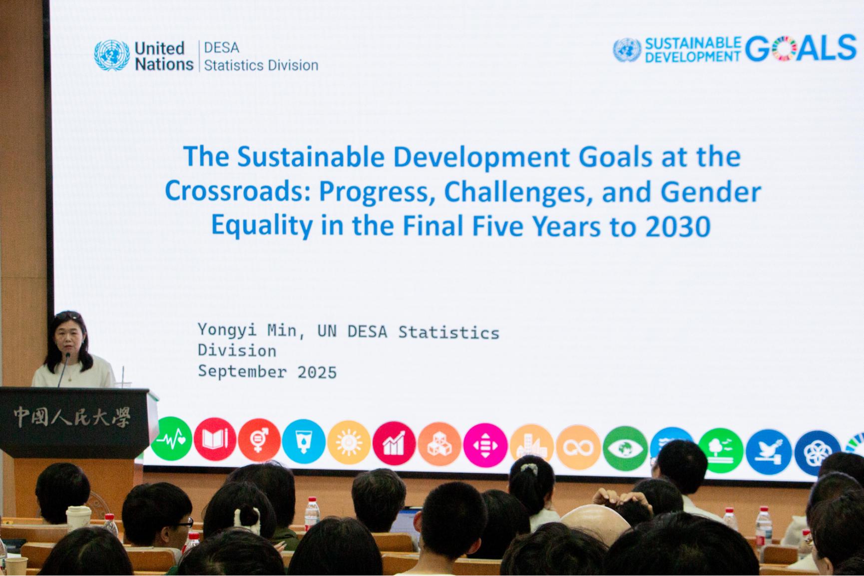 9月24日,闵永怡以“可持续发展目标的十字路口:到2030年最后五年的进展、挑战与性别平等”为题作会前专题讲座。来自中国国家统计局系统、兄弟高校和yl7703永利的近200位嘉宾共同探讨了联合国可持续发展目标统计测度的进展与挑战。
