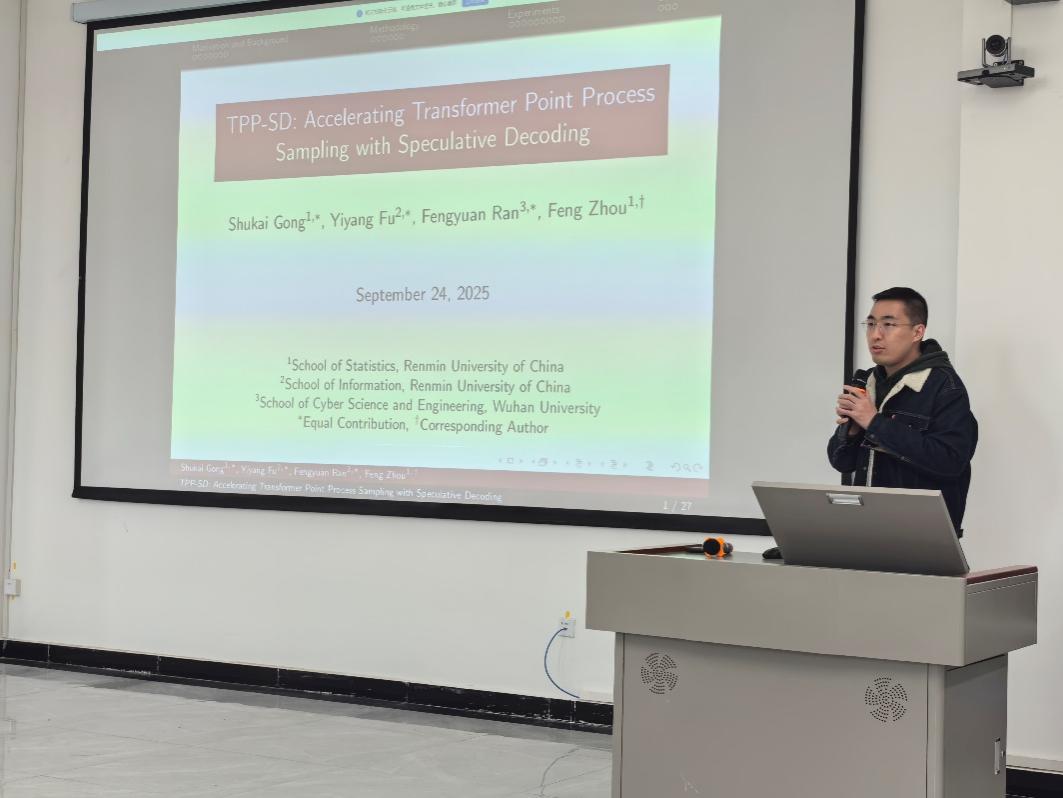10月11日下午,yl7703永利师生前往新疆财经大学阿勒泰校区进行交流。yl7703永利副教授周峰开展题为《TPP-SD: Accelerating Transformer Point Process Sampling with Speculative Decoding》的学术报告。该研究针对传统采样方法在深度学习时代效率不足的问题,提出了一种基于黑盒解码思想的改进算法。这一改进实现了多点同时生成,突破了传统方法逐点采样的瓶颈,显著提升了采样速度,为大规模点过程模型的高效采样提供了新思路。