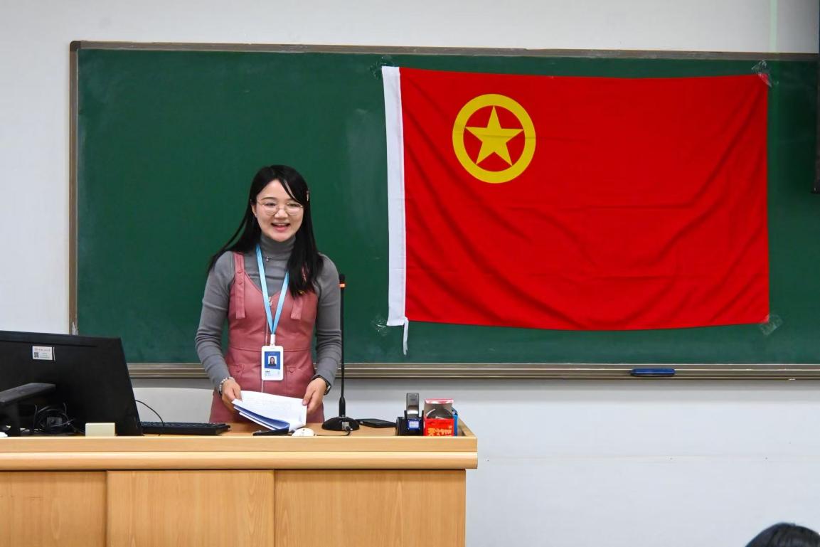 活动伊始,全体师生共同观看了抗美援朝的红色主题短片。镜头里,抗美援朝战场上的烽火硝烟、英雄儿女的浴血奋战历历在目,现场的氛围庄重而热烈。短片落幕,徐澜玲详细介绍了“先锋·人大组歌”的创作背景与深刻内涵,并鼓励同学们在组歌的创作与传唱中,深刻体悟抗美援朝精神的时代价值,让红色旋律成为青春前行的铿锵节拍。